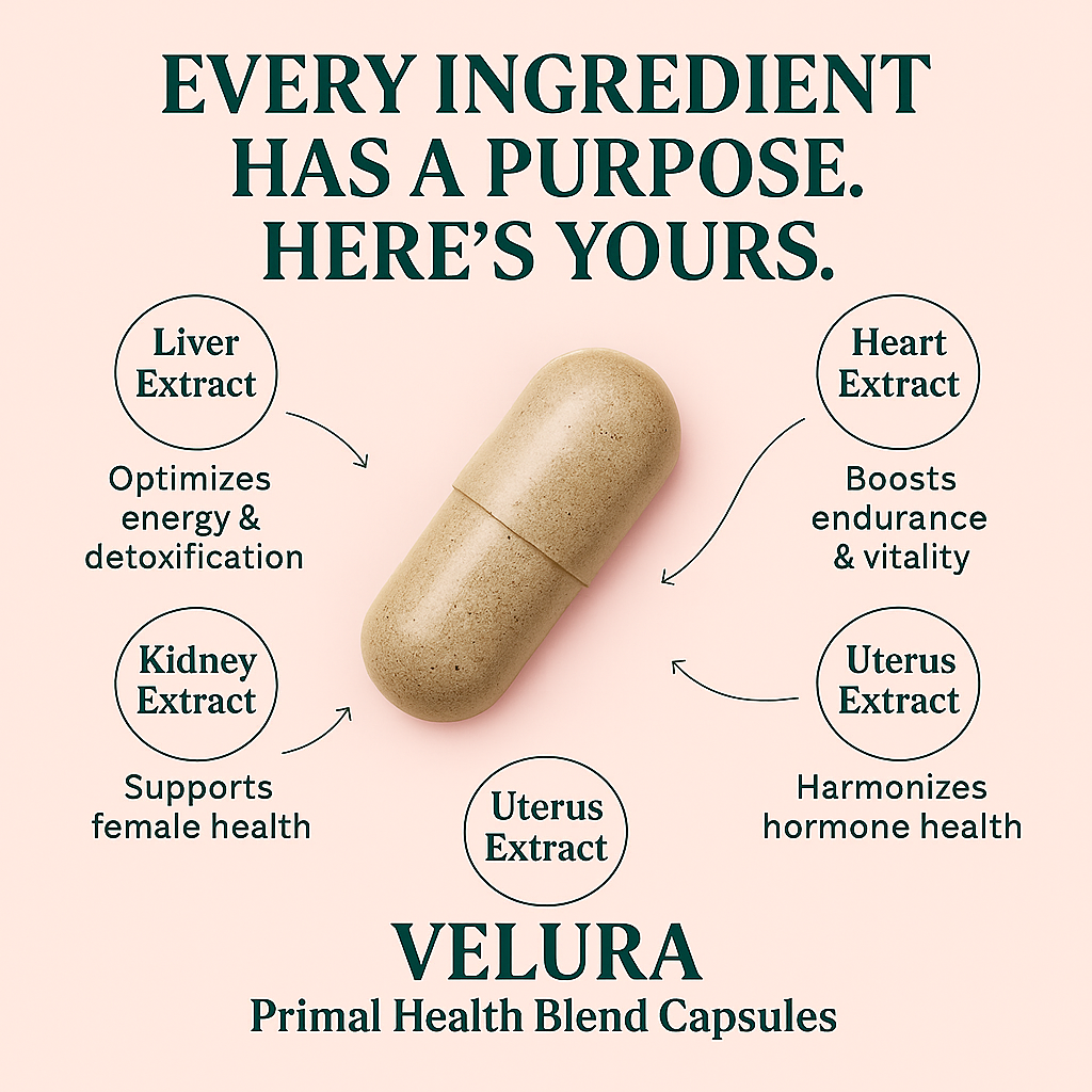 Velura is a nutrient-rich blend of premium bovine organ extracts — including liver, heart, kidney, uterus, and ovary — formulated to support hormonal balance, natural energy, and mental clarity. It’s designed for women who want to feel steady, focused, and energized without relying on caffeine or synthetic stimulants.